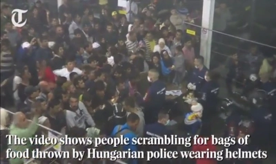 O înregistrare video arată modul halucinant în care sunt hrăniți oamenii. Aflați într-un loc înconjurat de garduri, migranții se înghesuiau să prindă sandvișurile aruncate de polițiștii ungari.