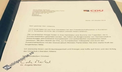 Prezidențiabilul ACL, Klaus Iohannis, a prezentat o scrisoare de susținere din partea cancelarului german, Angela Merkel. În această scrisoare, Merkel își arată susținerea directă pentru Iohannis.