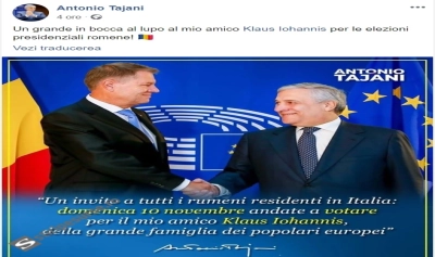 Fostul preşedinte al Parlamentului European Antonio Tajani a postat, duminică, pe pagina sa de Facebook, o fotografie în care apare dând mâna cu preşedintele Klaus Iohannis şi îi îndeamnă pe toţi românii din Italia să-l voteze pe acesta la alegerile din 10 noiembrie.