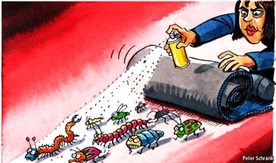 Dar asta nu e tot. Cei de la The Economist i-au dedicat un articol în care au lăudat lupta acesteia cu politicienii corupţi, dar i-au făcut şi o caricatură incredibilă. În imagine, Kovesi este înfăţişată cum ridică un covor şi acolo îi găseşte pe marii corupţi ai ţării. Aceştia sunt stârpiţi cu ajutorul unui spray care îi întruchipează pe procurorii anticorupţie. Corupţii României încearcă să fugă, dar nimeni nu scapă de spray-ul şefei de la DNA. Furnici, gândaci, muşte, şerpi sau caracatiţe, sub această formă sunt înfățișați corupții. Toate sunt în cătarea şi privirea aprigă a lui Kovesi, îmbrăcată în albastru, precum un poliţist. Fundalul "roşu" e corupţie al României este "albit" de spray-ul procurorului şef de la DNA.