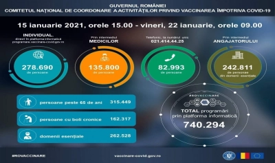 Conform CNCAV, în perioada 15 ianuarie ora 15:00 până vineri, 22 ianuarie, ora 9:00, pe platforma informatică programare.vaccinare-covid.gov.ro s-au programat 740.294 persoane din etapa a doua de vaccinare.