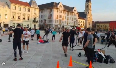 Totodată, în Piaţa Unirii au fost duse şi greutăţi de tot felul pentru exerciţii de forţă, dar şi alte aparate folosite de obicei în sălile de fitness.