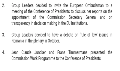 Liderii de grup au decis sa aiba o dezbatere despre statul de drept din Romania in sedinta plenului din octombrie, reiese din document.