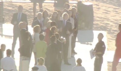 Liderii G7 au asistat la un show acrobatic al forţelor Red Arrows de pe plajă.