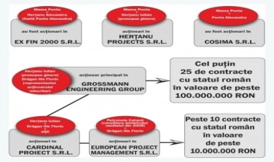 Cea mai bănoasă afacere încheiată de compania GROSSMANN cu statul român o reprezintă câştigarea, pe 20 ianuarie 2012, a unei licitaţii în valoare de 49.430.000 lei (10.750.000 euro) pentru extinderea reţelei de canalizare din localitatea Comarnic. Deşi valoarea contractului este destul de mare, nu în ea constă marea surpriză. De-a dreptul şocant este numele firmei împreună cu care Iulian Herţanu a câştigat contractul: SC EURO CONSTRUCT TRADING '98 SRL, firmă considerată apropiată de preşedintele Traian Băsescu. EURO CONSTRUCT TRADING '98 SRL este strâns legată şi de numele Elenei Udrea. Fost ministru şi membru marcant al PDL, precum şi colaboratoare apropiată a lui Traian Băsescu, Elena Udrea mai este cunoscută şi ca reprezentanta „grupului de la Golden Blitz" (format din Sorin Vulpescu şi Dan Besciu, parteneri de afaceri şi vechi prieteni ai lui Dorin Cocoş, soţul Elenei Udrea). Aceiaşi Sorin Vulpescu şi Dan Besciu sunt şi patronii SC EURO CONSTRUCT TRADING'98 SRL, companie care, iată, face afaceri cu unul dintre membrii familiei lui Ponta. Mai trebuie spus că grupul de la Golden Blitz a mai fost asociat cu afaceriştii din apropierea liderilor PSD. Dorin Cocoş, soţul Elenei Udrea, a făcut afaceri cu oamenii lui Adrian Năstase, Alexandru Bittner şi Adrian Petrache, informează România Liberă.