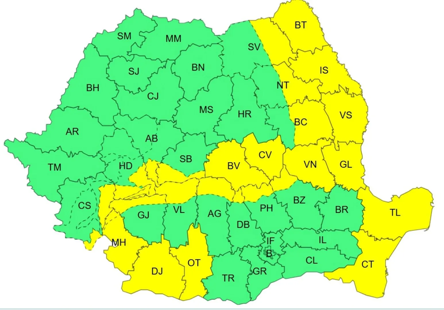 Cod galben, intervalul duminică ora 10.00 - luni ora 10.00