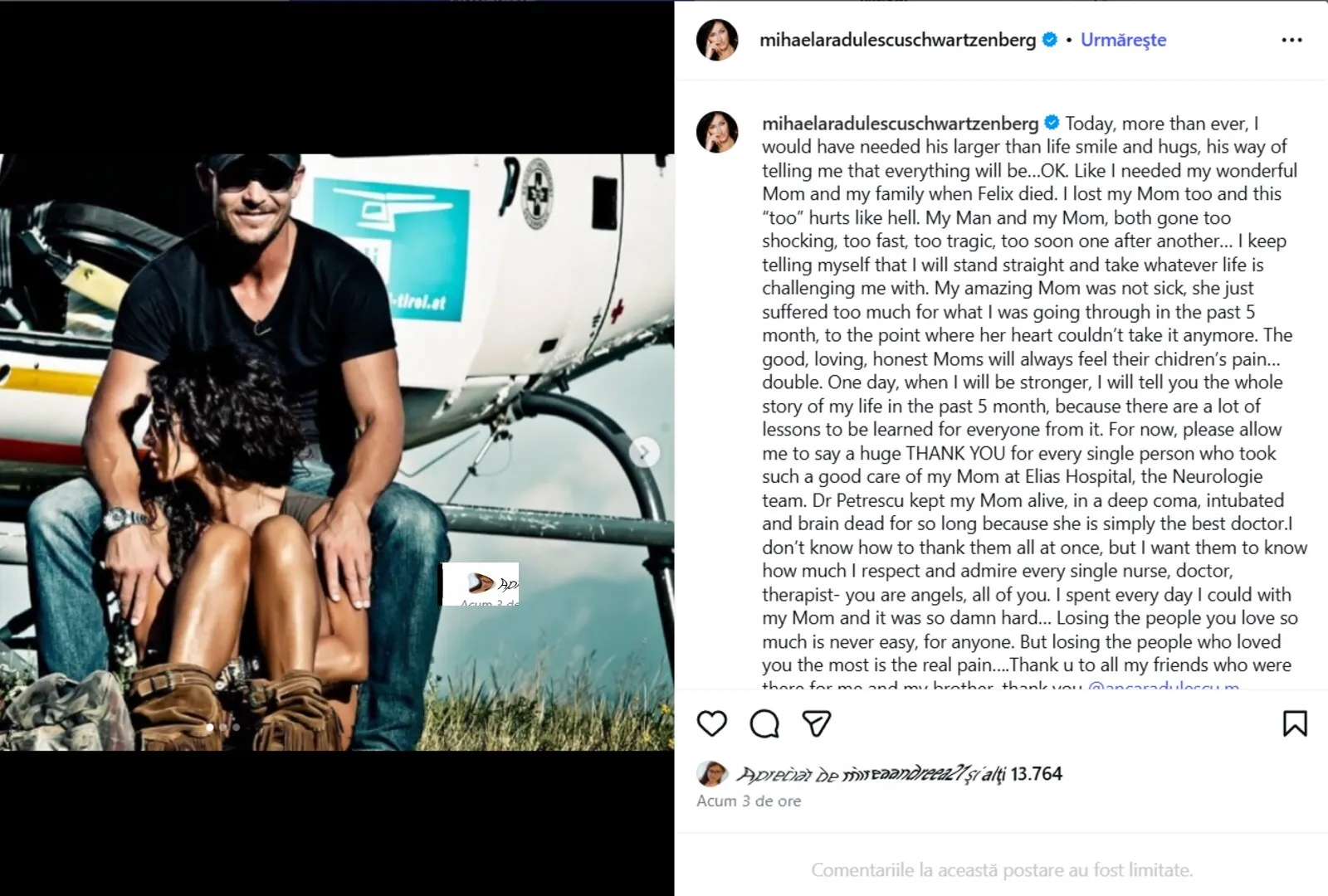 Deocamdată, vă rog să-mi permiteți să spun un enorm MULȚUMESC pentru fiecare persoană care a avut grijă de mama mea la Spitalul Elias, echipa Neurologie. Dr Petrescu a ținut-o pe mama în viață, în comă profundă, intubată și în moarte cerebrală atâta timp pentru că pur și simplu este cea mai bună doctoriță. Nu știu cum să le mulțumesc tuturor odată, dar vreau să știe cât de mult respect și admir fiecare asistentă, medic, terapeut- Sunteti ingeri cu totii. Mi-am petrecut fiecare zi pe care am putut-o cu mama și a fost al naibii de greu… Să pierzi oamenii pe care îi iubești atât de mult nu este niciodată ușor, pentru nimeni. Dar să pierzi oamenii care te-au iubit cel mai mult este adevărata durere…. Mulțumesc tuturor prietenilor mei care au fost alături de mine și fratele meu”, a fost mesajul transmis de Mihaela Rădulescu.