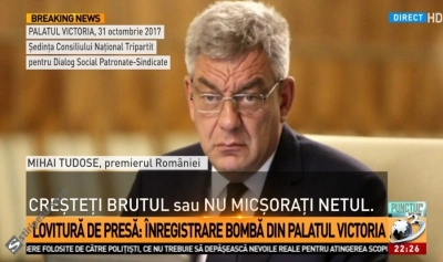 Premierul Mihai Tudose a fost înregistrat, pe ascuns! S-a întâmplat chiar în Palatul Victoria. O înregistrare de la întâlnirea premierului Mihai Tudose din cadrul Consililui Tripartit a fost făcută publică. Premierul cere patronatelor să exprime public opinia că salariile nu vor fi tăiate.