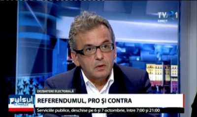 "La Referendum votăm protecția constituțională a definiției căsătoriei, în termeni stricți juridici", spunea Mihai Gheorghiu, când cadrul s-a mișcat, iar pe post s-a auzit, încet, "Ce penibili sunteți!"