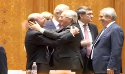 Moment inedit în Parlamentul României. Fostul președinte Traian Băsescu a fost sărutat pe frunte de președintele Comisiei Europene Jean Claude Juncker.