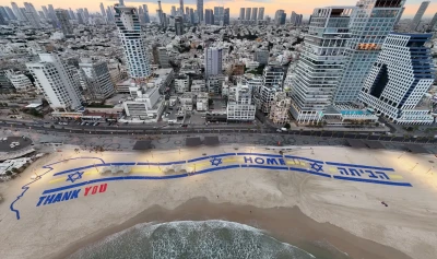 Un semn masiv de mulțumire adresat președintelui american Donald Trump este afișat pe plaja din Tel Aviv, arată imagini difuzate de Channel 12.