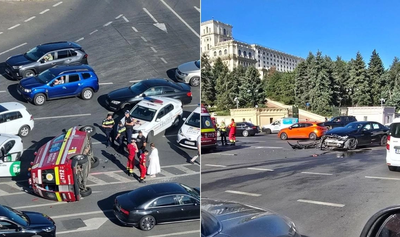 O ambulanță SMURD s-a răsturnat marți dimineața în București, în urma unei coliziuni cu un autoturism.