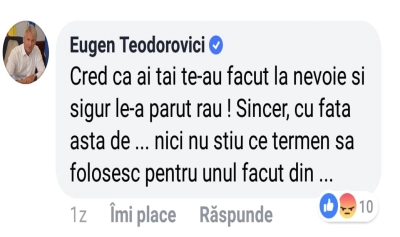 "Cred că ai tăi te-au făcut la nevoie și sigur le-a părut rău. Sincer, cu fața asta de..nici nu știu ce termen să folosesc pentru unul făcut din..", este unul dintre raspunsurile date de ministru unei persoane care i-a comentat la o postare din 4 iulie.