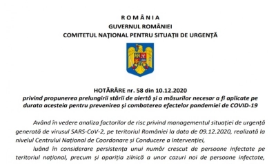 Comitetul Naţional pentru Situaţii de Urgenţă a adoptat Hotărârea numărul 58, în ședința de astăzi, 10 decembrie. CNSU propune prelungirea cu 30 de zile a stării de alertă.