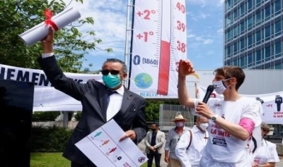 Ajunşi în faţa sediului OMS, reprezentanţi ai reţelei de activişti din domeniul luptei împotriva încălzirii globale Doctors for Extinction Rebellion (Doctors4XR) au înmânat o petiţie directorului general al OMS, Tedros Adhanom Ghebreyesus.