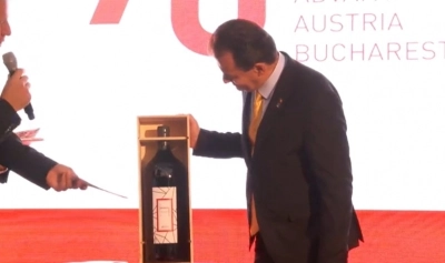 Premierul Ludovic Orban a fost miercuri protagonistul unui episod amuzant, după ce a primit o sticlă uriașă de vin la un eveniment organizat de Ambasada Austriei în România.
