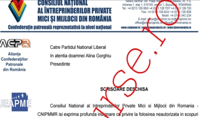 Va solicitam ca pozitia noastra sa fie postata pe site-ul dvs.si sa fie transmisa mass-media si tuturor destinatarilor brosurii PNL Business Plan Romania.”, se arată într-un document trimis de CNIPMMR președintelui PNL, Alina Gorghiu.
