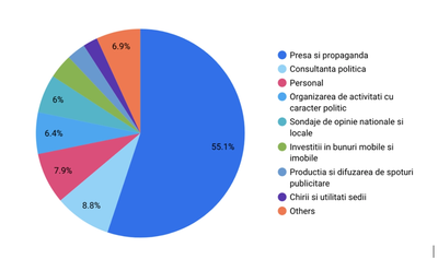 Per total, cele mai mari sume au fost cheltuite pentru: presă şi propagandă -109,3 milioane de lei (55% din totalul cheltuielilor), consultanţă politică - 17,4 milioane de lei (8,8% din totalul cheltuielilor), personal - 15,7 milioane de lei (7,9% din totalul cheltuielilor), activităţi politice - 12,7 milioane de lei (6,4% din totalul cheltuielilor), sondaje de opinie - 11,8 milioane de lei (6% din totalul cheltuielilor), bunuri mobile şi imobile - 7,5 milioane de lei (3,8% din totalul cheltuielilor), producţia şi difuzarea de spoturi publicitare - 5,7 milioane de lei (2,9% din totalul cheltuielilor), alte categorii - 18 milioane de lei (9% din totalul cheltuielilor).