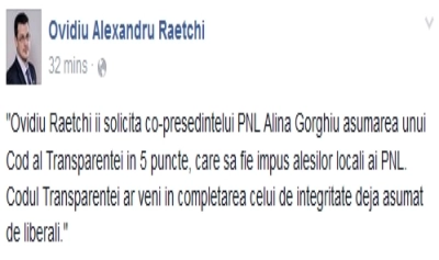Ovidiu Raețchi, participant la competiția internă a PNL pentru a deveni candidat la primăria sectorului 5, a trimis o scrisoare deschisă către Alina Gorghiu prin care îi cere acesteia ca, pe lângă Decalogul integrității, PNL să adopte un Cod al transparenței pentru candidații la alegerile locale.