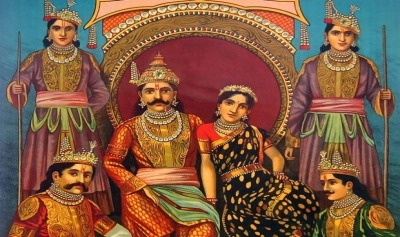 Eroii povestirii - cu autor necunoscut - sunt cinci flăcăi de stirpe regală, fraţii Pandava, care îşi dispută puterea cu clanul rival Kaurava. După o serie de aventuri uimitoare, aşa cum se întâmplă în toate epopeele, totul se termină cu bine, iar clanul Kaurava este învins de fraţii Pandava, care sărbătoresc evenimentul alături de soţia lor comună Draupadi, care împarte patul şi fericirea cu toţi cei cinci.
