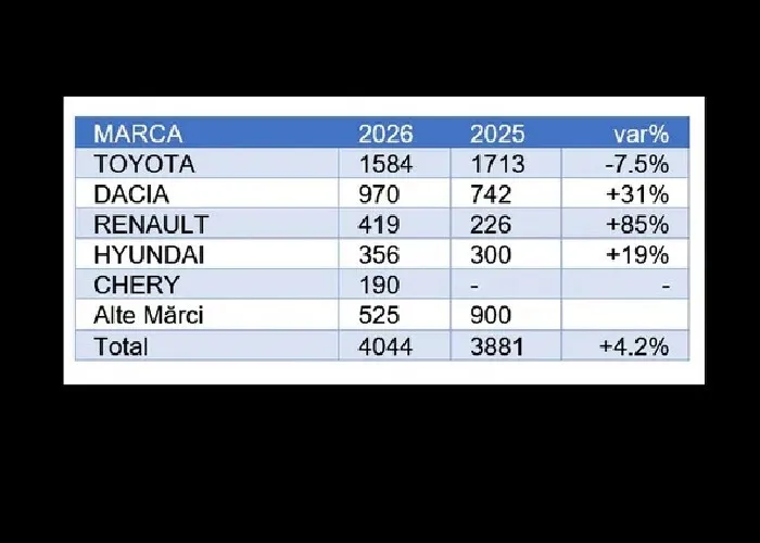 În cazul mașinilor hybrid fără reîncărcare din surse externe marca Chery a intrat în Top 5, pe locul 5. Top-ul celor mai vândute mașini hybrid în România, în perioada ianuarie–februarie 2026, este condus de Toyota Corolla, cu 644 unități, Dacia Bigster, cu 559 unități, și Toyota Yaris Cross, cu 450 unități.