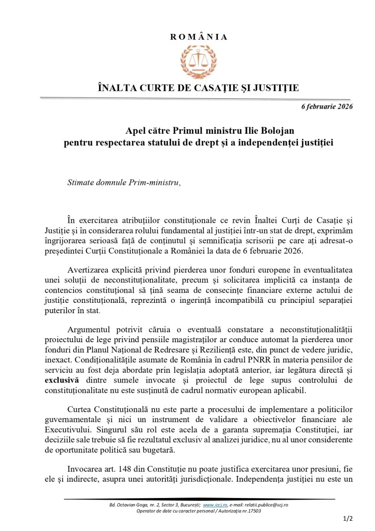 Apelul președintei ÎCCJ vine după ce premierul Ilie Bolojan a transmis, la 6 februarie, o scrisoare președintei CCR, în care a avertizat asupra riscului pierderii a aproximativ 230 de milioane de euro din PNRR, în condițiile în care Curtea ar amâna sau ar declara neconstituțională legea privind pensiile magistraților.