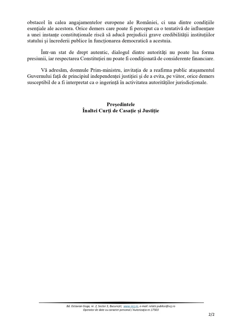„Independența justiției nu este un obstacol în calea angajamentelor europene ale României, ci una dintre condițiile esențiale ale acestora”, se arată în document. Orice demers care poate fi perceput ca o tentativă de influențare a unei instanțe constituționale riscă, în opinia președintei ÎCCJ, să aducă „prejudicii grave credibilității instituțiilor statului și încrederii publice în funcționarea democratică a acestuia”.