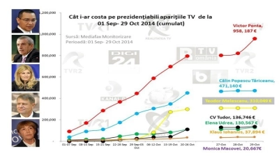 Prezidențiabilii s-au bucurat de spații generoase de emisie oferite de televiziuni, dar acum vine și nota de plată. Klaus Iohannis, Monica Macovei, Victor Ponta, Călin Popescu Tăriceanu şi Elena Udrea, urmaţi apoi, pe măsura înscrierii în cursă, de Teodor Meleşcanu, Dan Diaconescu, Corneliu Vadim Tudor au fost urmăriţi în apariţiile lor live (fie în emisiuni, fie în conferinţe de presă, fie în intervenţii telefonice) de serviciul Mediafax Monitorizare, iar rezultatul a fost tradus în bani, potrivit tarifelor declarate la CNA de televiziuni în campania pentru europarlamentare.
