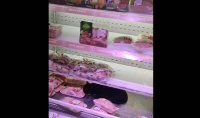 Scene incredibile au fost filmate într-un cunoscut lanț de magazine din Capitală! O pisică a intrat în vitrina frigorifică a gigantului Carrefour.
