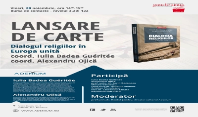 În același spațiu, de la ora 14:30, va fi lansată o nouă apariție din colecția Headline, Dialogul religiilor în Europa unită, coordonatori Iulia Badea Guéritée și Alexandru Ojică. Vor participa: Iulia Badea Guéritée, Alexandru Ojică, Sorin Bocancea, Mircea Vasilescu, Antonio Momoc, Cristian Pîrvulescu, Laurențiu Tănase și Raymond Clarinard. Evenimentul va fi moderat de Daniel Șandru, director editorial Adenium. Citiți fragmente din acest volum pe filme-carti.ro.