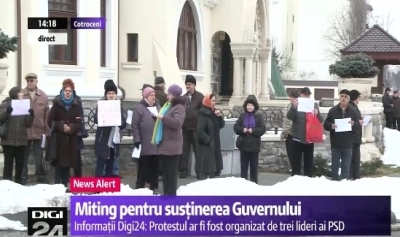 The people are chanting "Down with Iohannis!" and have placards reading: "Resign!," "We support the Government."