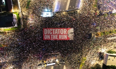 Pe un banner uriaş cu fundal roşu purtat de demonstranţii din Tel Aviv scria, lângă o fotografie a prim-ministrului Benjamin Netanyahu,"Dictator pe fugă".