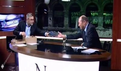 Traian Băsescu a acceptat invitația lui Radu Moraru de a fi intervievat din nou de patronul televiziunii unde a fost aspru criticat în ultima perioadă. După două ore de emisiune, Moraru i-a făcut un cadou inedit lui Băsescu.