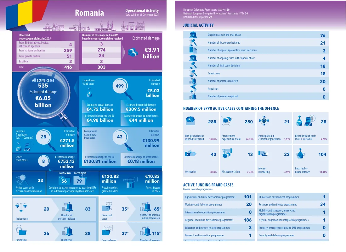 EPPO este parchetul independent al Uniunii Europene, responsabil cu investigarea și trimiterea în judecată a infracțiunilor care afectează interesele financiare ale UE. Iar raportul pe 2025 indică, la nivel european, 3.602 investigații în curs la finalul anului și o pierdere estimată de 67,27 miliarde euro.