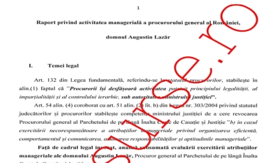 El a adăugat că raportul de evaluare, însoţit de propunerea de revocare a procurorului general, va fi transmis miercuri seara către Secţia pentru procurori a CSM în vederea studierii, analizării şi elaborării avizului consultativ, precum şi preşedintelui României pentru a decide potrivit competenţelor legale ce îi revin.