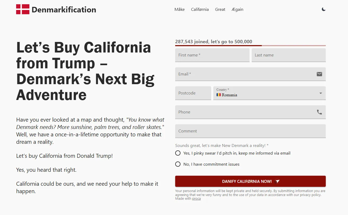 Apelul este în prezent publicat pe un site web numit Denmarkification.com. Pagina, cu vădită tentă ironică, include o listă uriașă de motive pentru cumpărarea Californiei și folosește chiar justificarea lui Trump pentru preluarea Groenlandei.