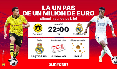 Viziune, inspirație, curaj. Sunt calitățile care l-au dus pe un parior Superbet aproape de statutul de milionar în euro grație unui bilet fabulos, cu 12 evenimente Antepost și o cotă totală de 421064.85 repetat de cinci ori într-o agenție din Brașov! Și nu-și putea alege un meci mai bun pentru desăvârșirea operei decât finala Ligii Campionilor dintre Real Madrid și Borussia Dortmund, partidă în care eroul finalului de sezon speră că "galaticii" vor câștiga a 15-a Cupă cu Urechi din palmares și îi vor schimba viața.