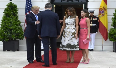 Cuplul prezidenţial american i-a primit la Casa Albă pe regele şi regina Spaniei. Donald şi Melania Trump şi-au întâmpinat oaspeţii pe covorul roşu, întins la intrarea sudică a Casei Albe.