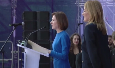 Prima care a luat cuvântul la mitingul de la Chişinău a fost preşedinta Maia Sandu, care a reiterat că Republica Moldova trebuie să fie membră a UE până în 2030.
