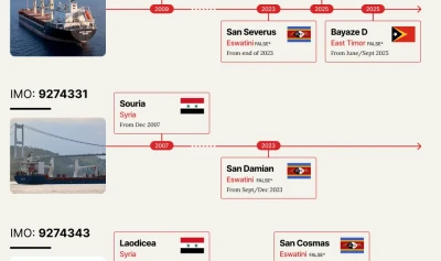 De atunci, navele au fost rebotezate și au navigat „în umbră”, fără transpondere, sub steaguri false — Gambia, Eswatini, Timorul de Est —, transportând grâne ucrainene din porturile ocupate Sevastopol și Kavkaz către Siria și Egipt.