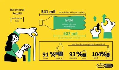 Sistemul de Garanție-Returnare (SGR), coordonat de RetuRO, a înregistrat în luna septembrie 2025 o rată de returnare de peste 90% pentru toate cele trei tipuri de ambalaje – PET, aluminiu și sticlă. Este a doua lună consecutivă în care pragul de 90% este depășit, semn că programul câștigă tot mai multă încredere în rândul consumatorilor.