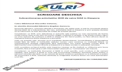 ULRI, pe aceasta cale, doreste sa-si manifeste dezaprobarea, incredulitatea si dezamagirea totala fata de MAE si institutiile statului roman, care continua cu motivatii hilare, sa subventioneze aceasta organizatie fara raspundere nici macar limitata numita BOR, in detrimentul unei sustineri directe a Diasporei si a clasei sociale cu adevarat nevoiase.