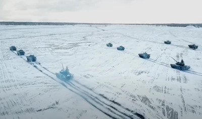 Ministerul Apărării din Rusia a publicat un videoclip care arată tancuri, elicoptere și alte vehicule militare angajându-se în ”progrese sincronizate pe un teritoriu acoperit de zăpadă”.