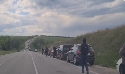 Un videoclip postat pe Telegram de Centrul pentru Comunicaţii Strategice şi Securitate Informaţională al guvernului ucrainean arată un şir lung de maşini pe marginea unui drum.