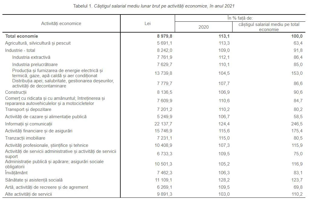 În domeniul informații și comunicații, salariul mediu lunar este de 22.137,7 lei, de 2,5 ori mai mult decât media pe țară, în cadrul activităților financiare și de asigurări – 15.746,9 lei, cu 75,4% mai mult decât media pe țară, iar în producția și furnizarea de energie electrică și termică, gaze, apă caldă și aer condiționat – 13.739,8 lei, cu 53% mai mult.