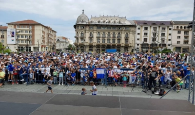 Fotbaliştii şi conducătorii clubului au sosit în piaţă, puţin după ora 13.00, cu un autocar descoperit, după un traseu prin Craiova şi au fost ovaţionaţi de suporteri. Înainte de sosirea lor, Andrei Păunescu a susţinut un concert pe scena amplasată în piaţă, scrie news.ro.