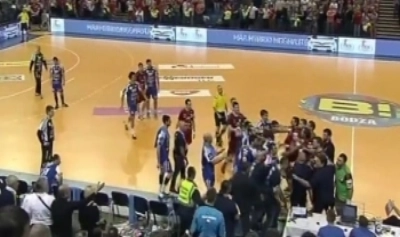 Moment tensionat la meciul dintre Pick Szeged și Veszprem (scor 26-27), din finala Cupei Ungariei la handbal masculin.