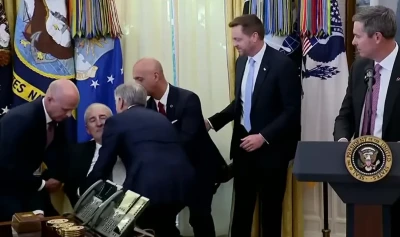 Bărbatul, identificat de Fox News ca fiind Gordon Findlay, director executiv la compania de produse biologice Novo Nordisk, stătea în picioare, lângă biroul preşedintelui Trump, dar a căzut secerat, în timp ce David Ricks, directorul executiv al Eli Lilly, vorbea despre un acord privind medicamentele pentru slăbit. Ricks şi-a întrerupt discursul în momentul în care bărbatul a căzut, în timp ce mai multe persoane din încăpere s-au grăbit să-l ajute.