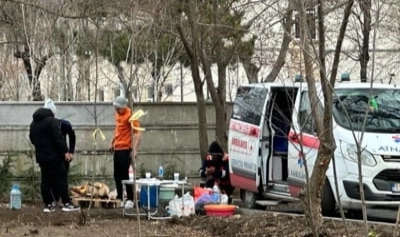 Imaginea arată o mașină de ambulanță înmatriculată în județul Ialomița parcată pe aleea unui parc din Constanța.
