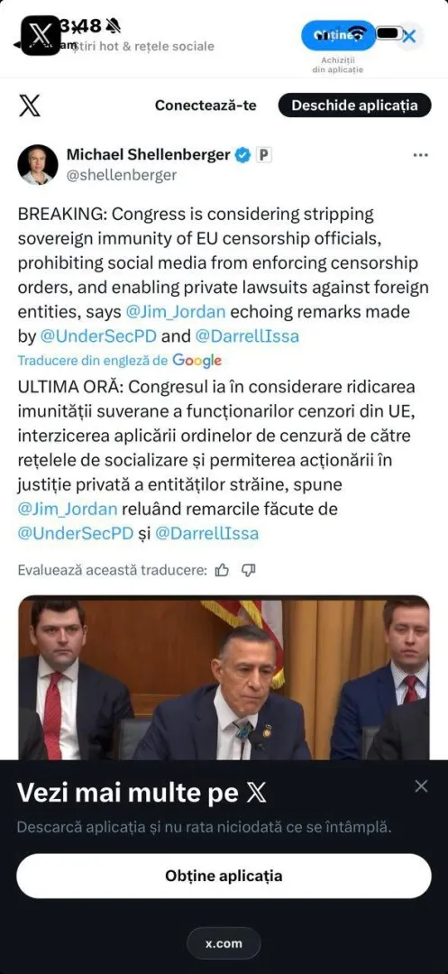“Congresul american ia în considerare ridicarea imunității acelor funcționari europeni responsabili de cenzură. Dar ridicarea imunității are loc doar în vederea unor proceduri legale și, eventual, penale. Anunțul vine de la adjuncta Secretarului de Stat Marco Rubio și de la doi congresmeni americani, iar postarea de pe X are deja un milion și jumătate de cititori.